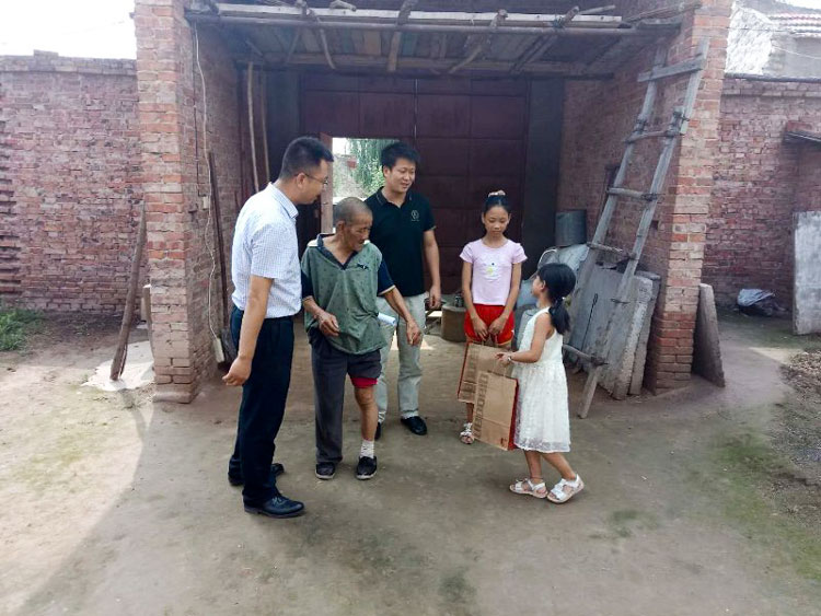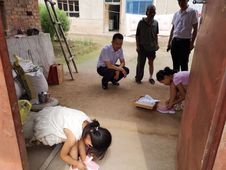7月6日,副区长潘旭辉又一次深入塬畔村看望慰问贫困户。在贫困户阎印足家里,劝慰他努力生活,大家会共同帮助他们一家人过上幸福的生活,并为阎欣雨和阎雨雨送上亲自购买的漂亮的运动鞋,穿上新鞋的孩子脸上露出了甜蜜的笑容。