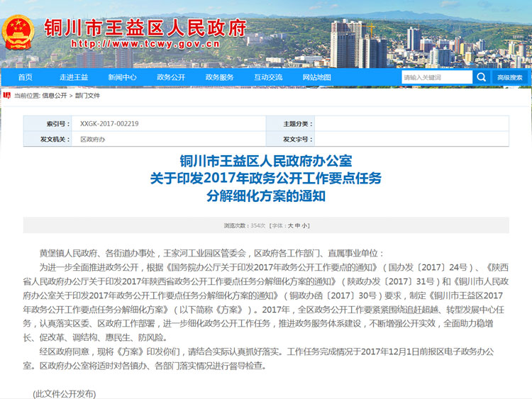完善政府信息公开制度。印发了《铜川市bt365开户办公室关于印发2017年政务公开工作要点任务分解细化方案的通知 》《铜川市bt365开户办公室关于进一步推进政务公开有关工作的通知》《铜川市bt365开户办公室关于2017年铜川市王益区落实省市政务公开工作绩效评估指标任务分解表的通知》等文件,为全区信息公开工作指明了方向,明确了重点。