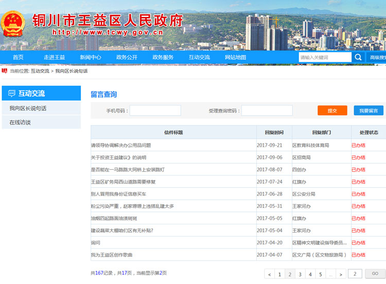 (四)互动交流。办好网民留言、解决群众反映问题,是区政府贯彻党的群众路线和执政为民的重要体现。为群众办事提供方便是我办的一项重要工作。作为关注民生、解决民忧的重要内容,作为汇集民智、服务决策的重要载体,不断探索,完善机制,扎实开展办理工作。我办利用开设的我向区长说句话互动交流栏目,为政府和百姓勾通架起了一座桥梁。截止目前,共收到群众来信19封,已全部批办,有力地促进了百姓反映诉求,办事难等一系列问题的解决。
